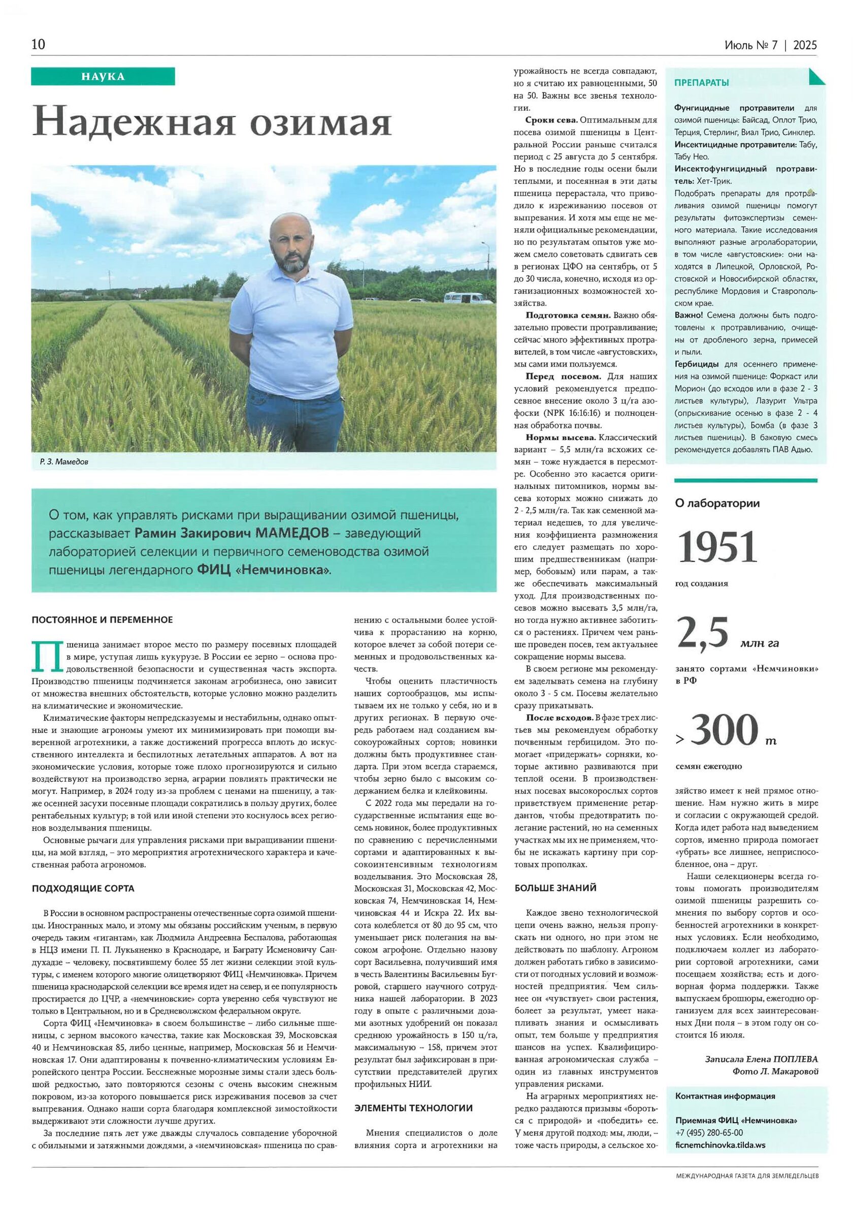 В новом выпуске международной газеты для земледельцев «Поле августа» Рамин Закирович Мамедов, канд. с.-х. наук, заведующий легендарной лабораторией селекции и первичного семеноводства озимой пшеницы