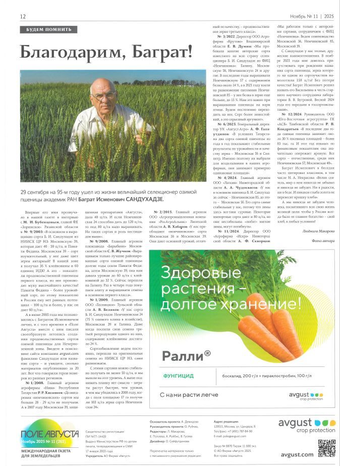 В свежем выпуске международной газеты для земледельцев «Поле августа» опубликована статья, посвященная памяти выдающегося ученого, доктора сельскохозяйственных наук, профессора, академика РАН Баграта Исменовича Сандухадзе.